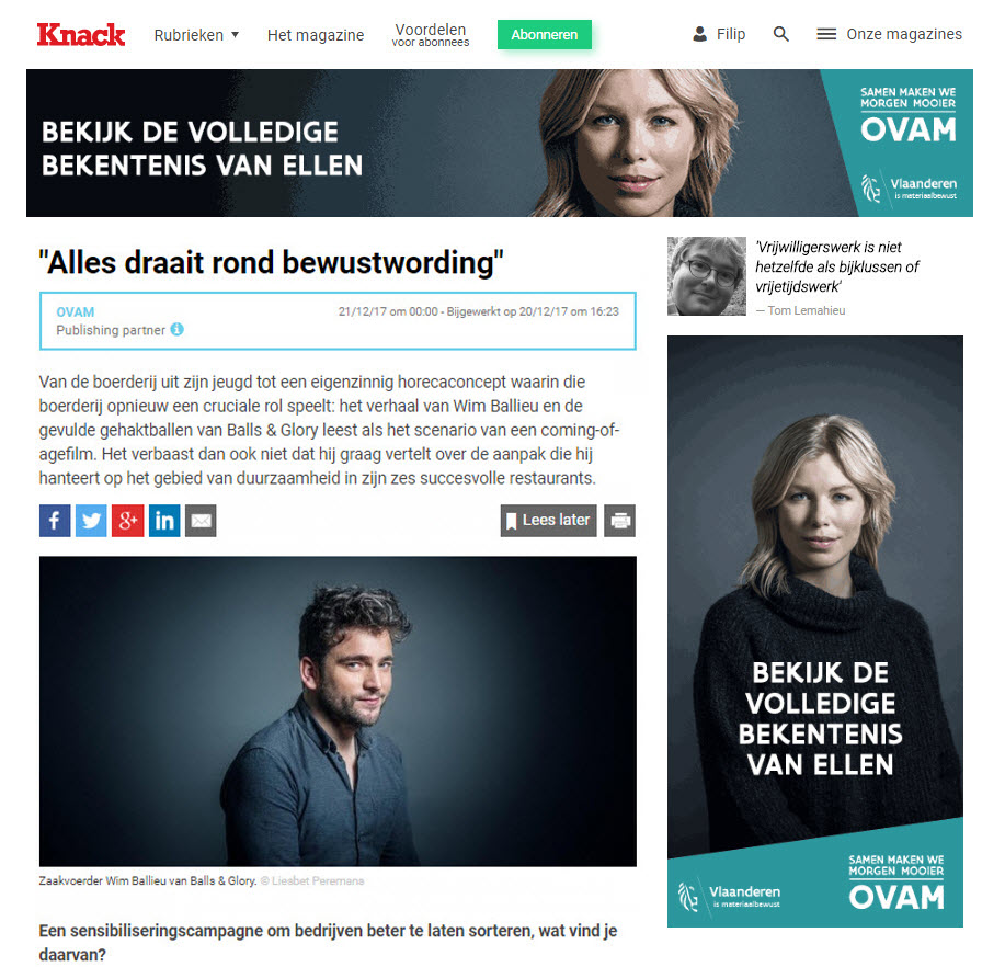 Augmenter la prise de conscience en matière de déchets et de tri, c’est ce que fait la campagne de publicité native sur les canaux Knack. Au menu, il y avait entre autres des interviews avec des entrepreneurs couvrant la façon dont ceux-ci abordent la question au sein de leur entreprise.